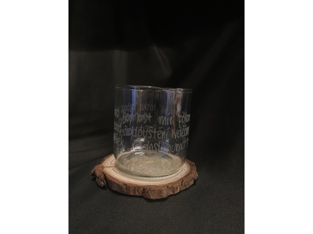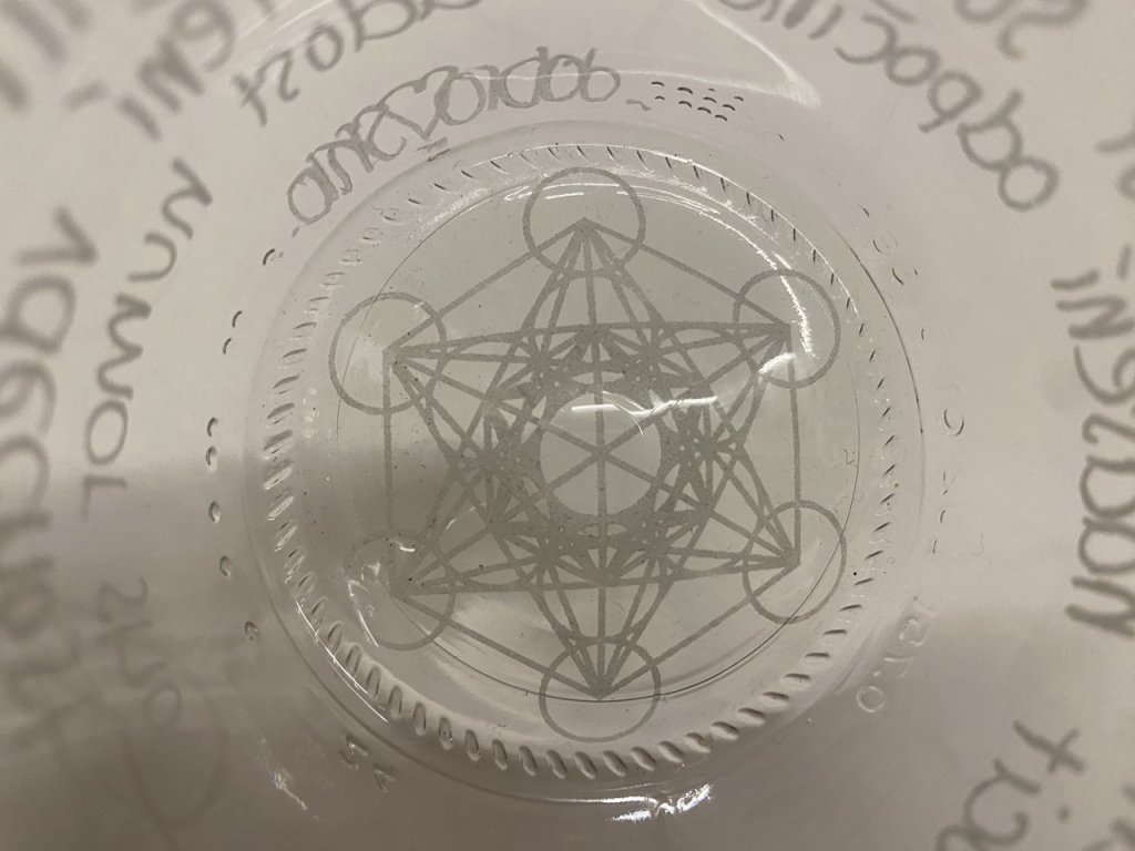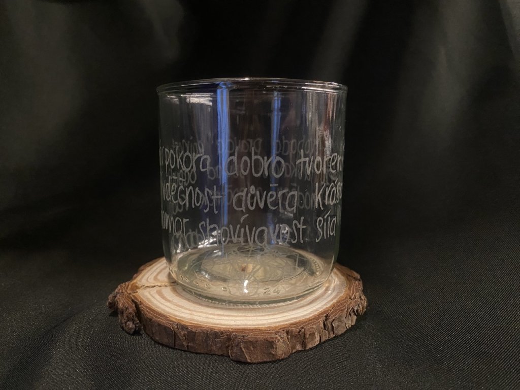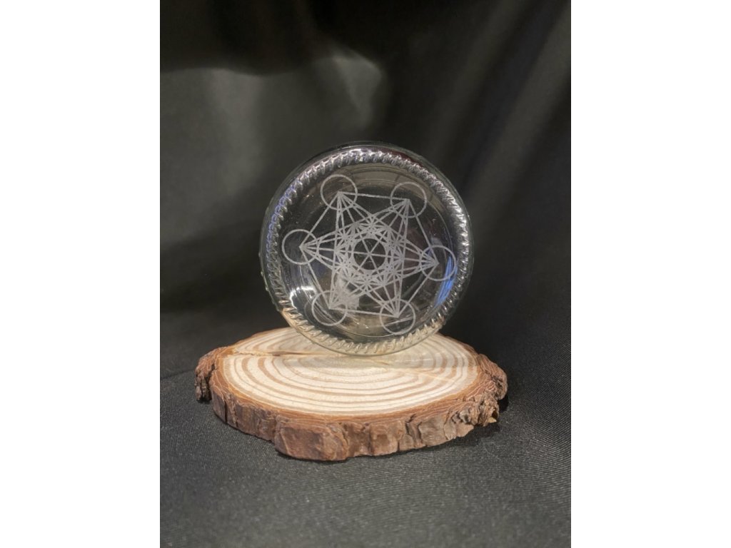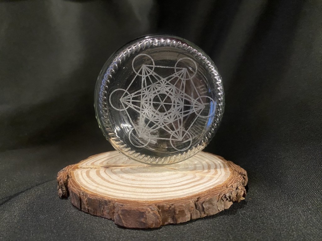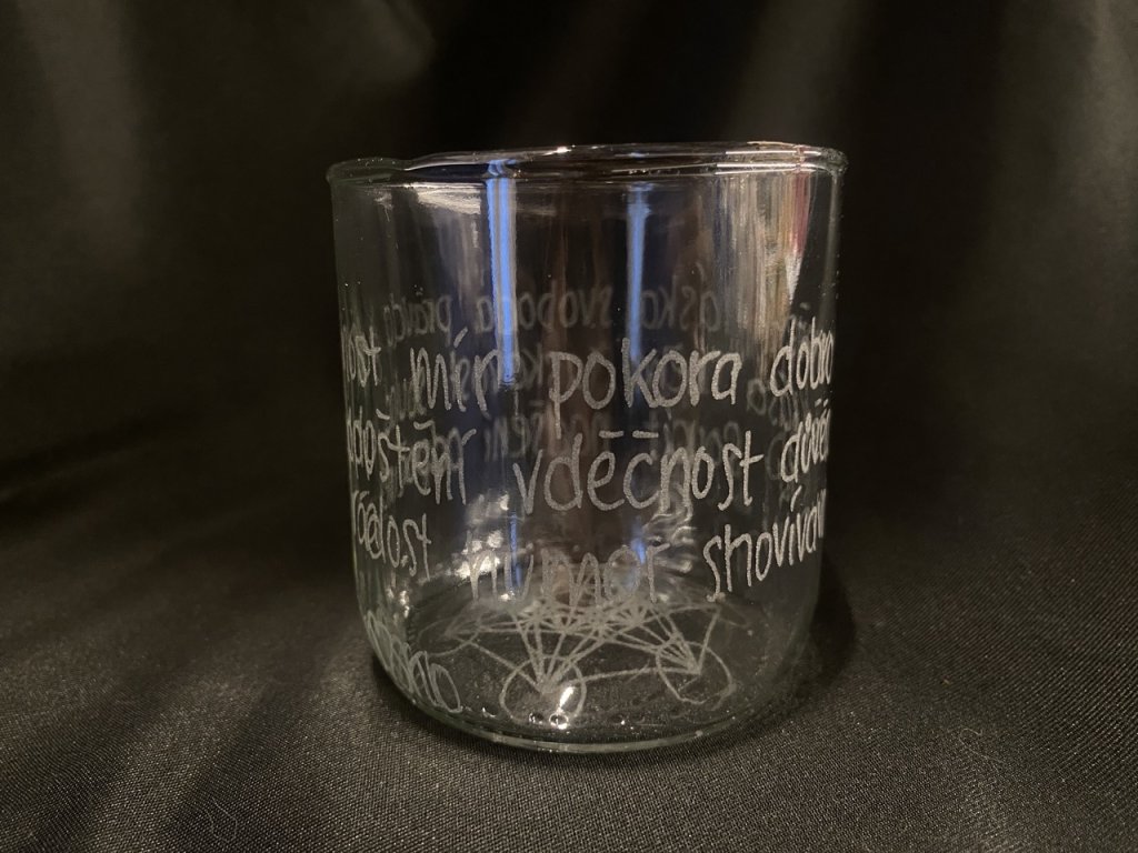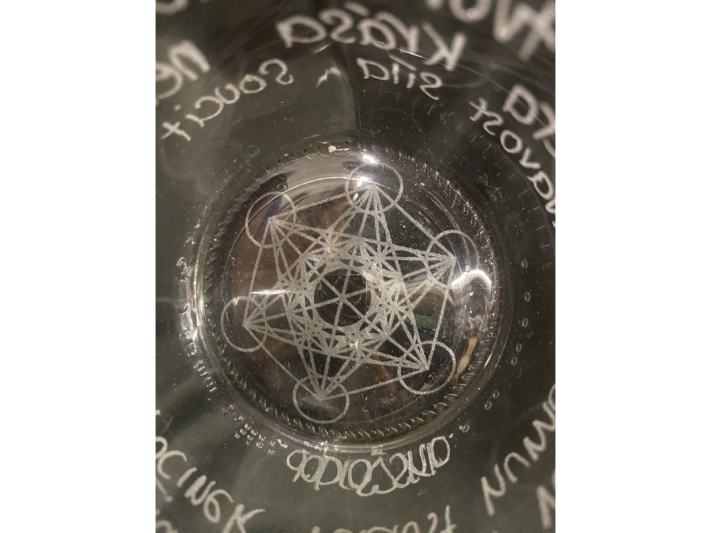 Zdobí ji 22 dobře čitelných dobroslov a metatronova krychle. Je nádherná i jako svícen (trochu soli do ní a čajovou svíčku).