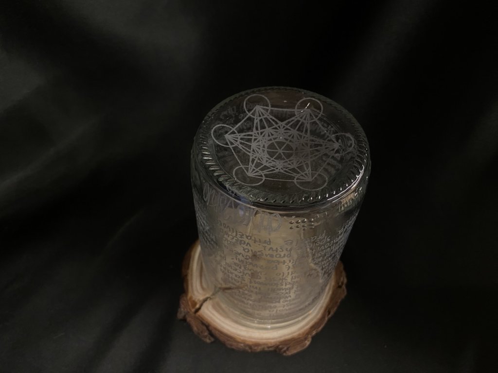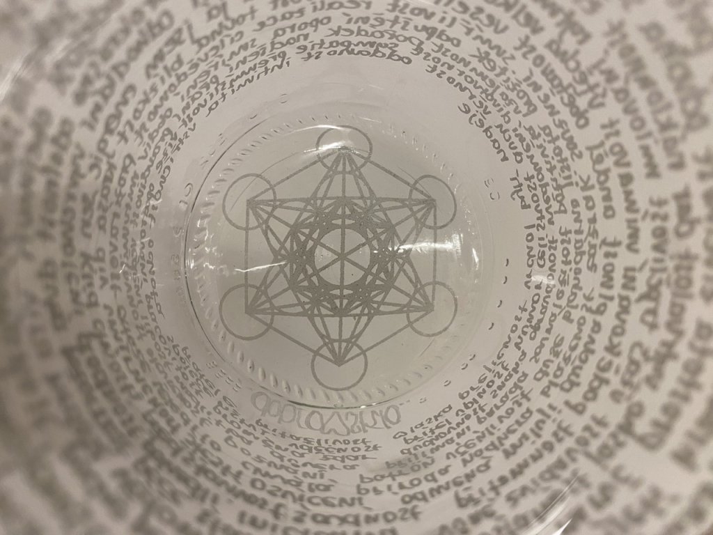 Kouzelná sklenka ve střední verzi (0,3l). Krásná, takřka křišťálová nádhera. 222 dobroslov v kombinaci se silným symbolem metatronovy krychle - to je záruka spokojeného a léčivého pití. Stálice v nabídce.