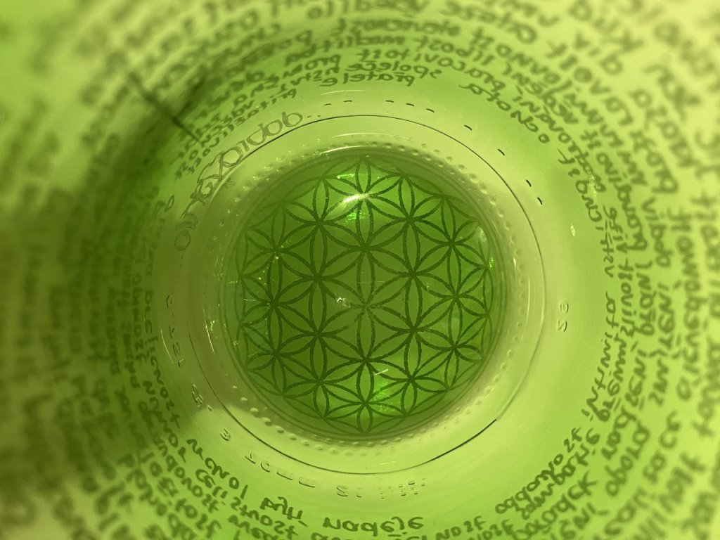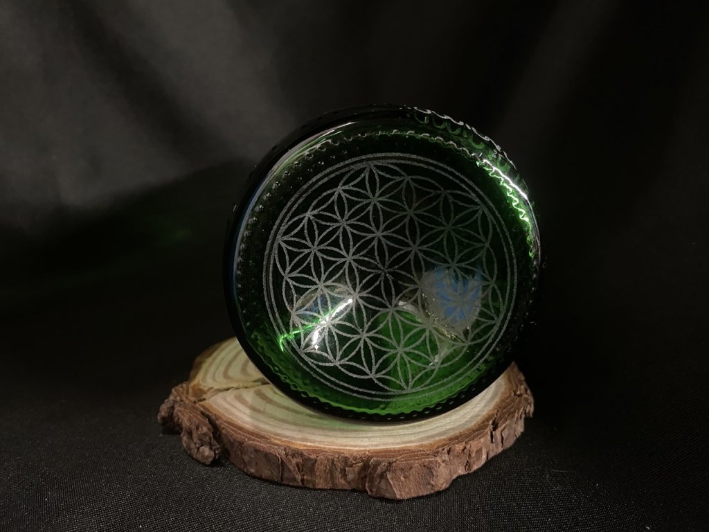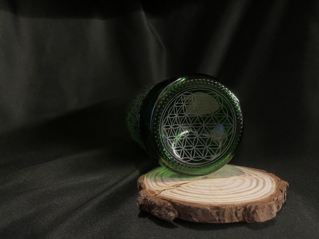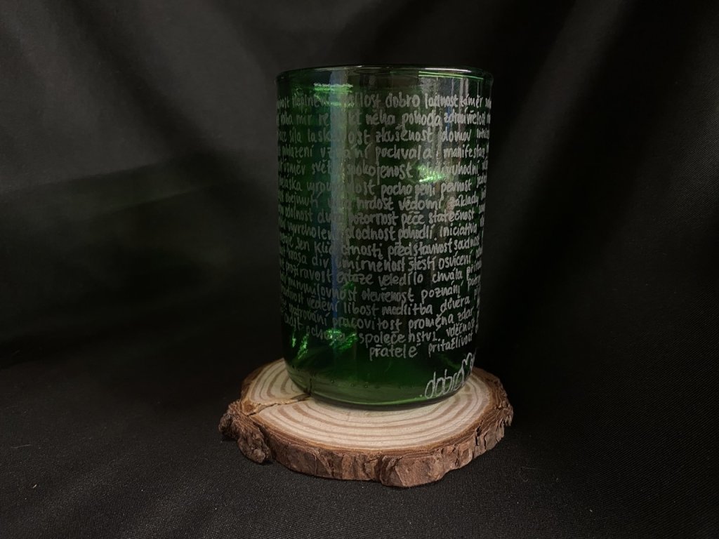 Trávově zelený klasik. Oku libá a funkční sklenička, gravírována 222 různými dobroslovy a s květem života.