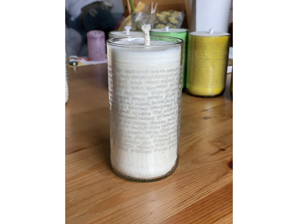 Jedna z prvních svíček, ve střední Dobrosklence "222 dobroslov" (0,4l) s květem života na dně. Nebarvená, vybavená tlustým knotem.Tuto velikost už nebudeme vyrábět - tedy poslední kus. PS: potřeba zkracovat knot.