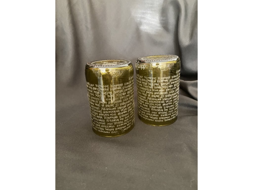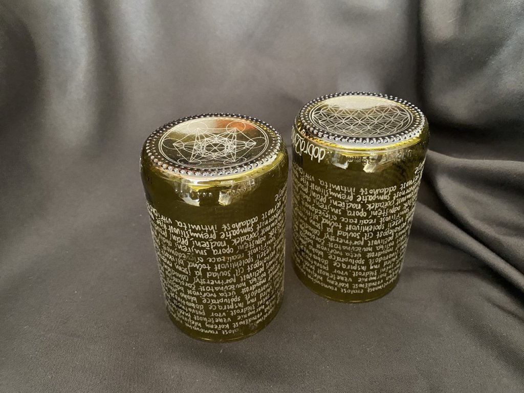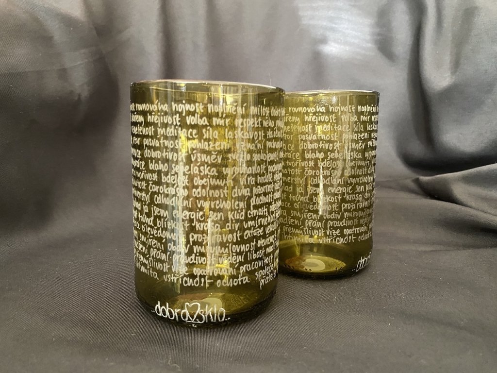 Nádherná dvojice dvou medově zlatých skleniček pogravírovaných 222 dobroslovy.