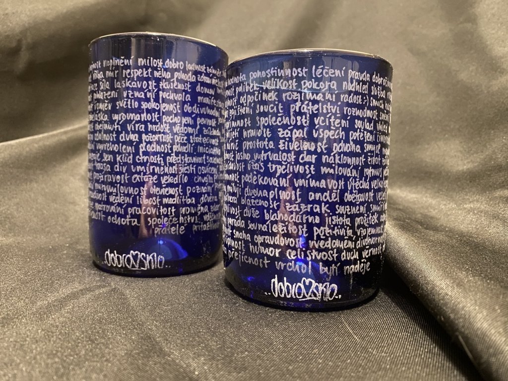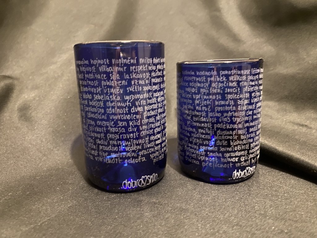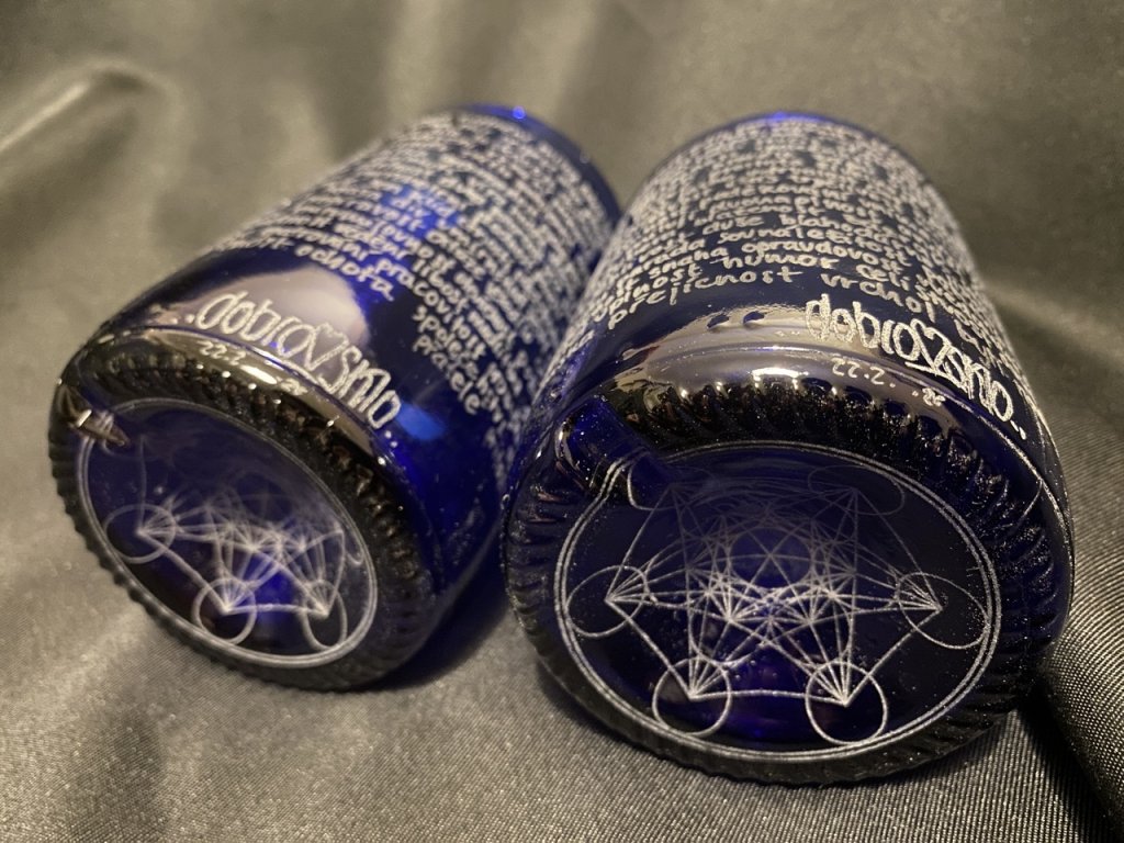 Nádherná dvojice dvou kobaltově modrých skleniček pogravírovaných 222 dobroslovy.