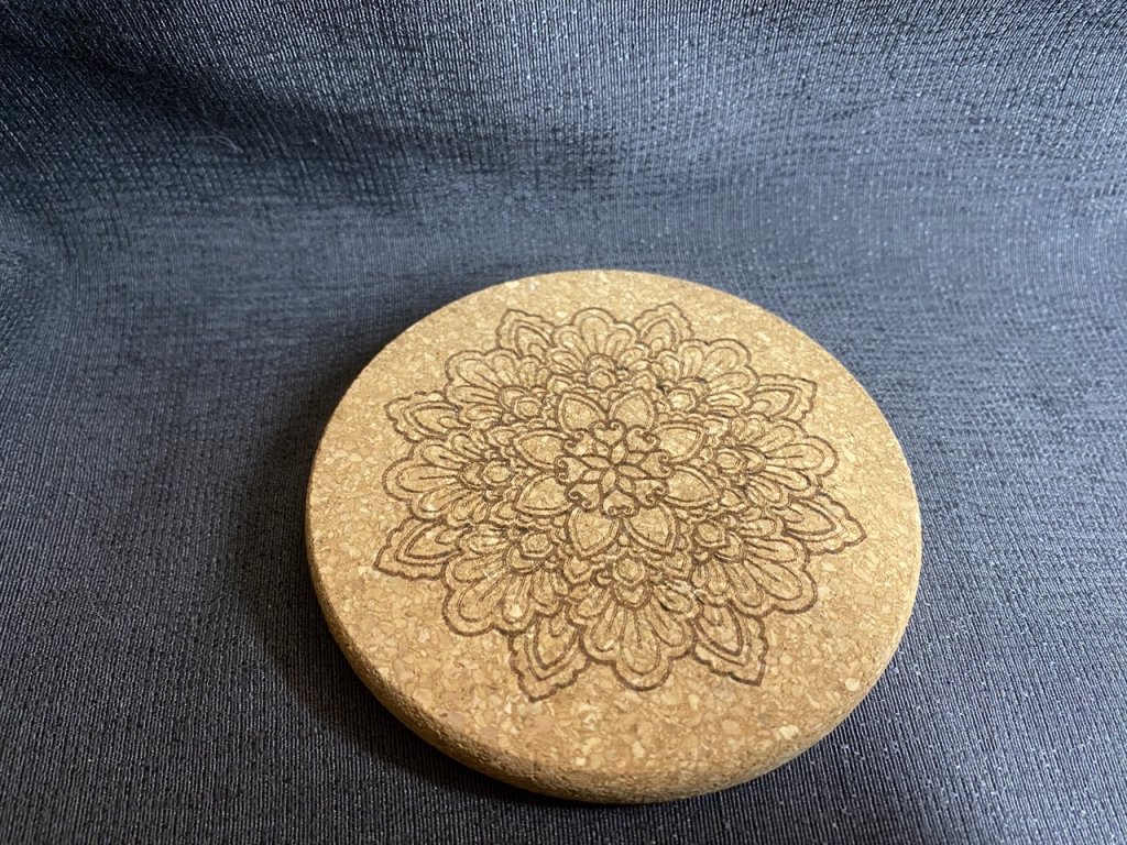 Podtácek s mandalou květiny. Tento symbol je oslavou lidského tvoření - dokonce vytvořen v umělecké kooperaci přímo pro DOBROSKLO. Korek je kvalitní, nerozpadne se, natož pak rozmočí. Průměr cca 8 cm.